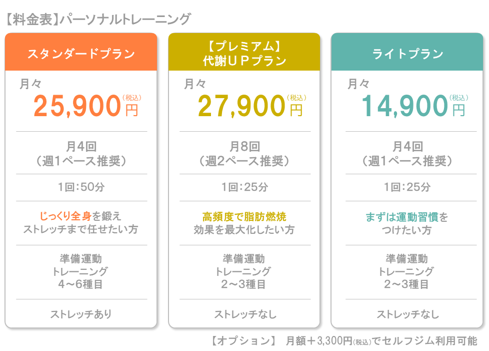パーソナルトレーニング 受付時間:9:00~22:00(要予約) +体験予約はこちら お支払い方法について ・クレジットカードまたは口座引落の月額払いとなります。 ・ご希望の月数が決まっている場合は一括払いにも対応しています。